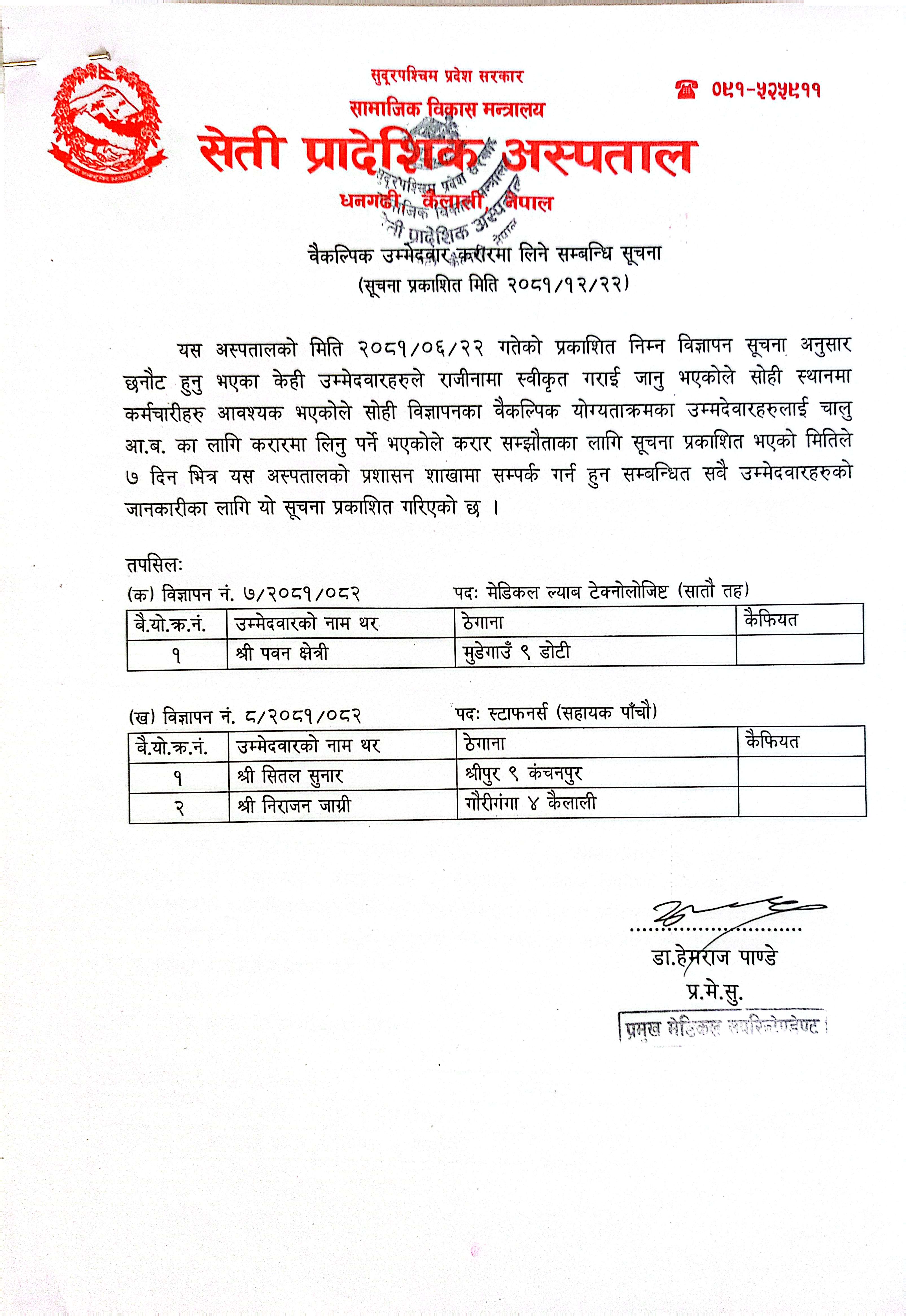 वैकल्पिक उम्मेदवार करारमा लिने सम्बन्धि सूचना